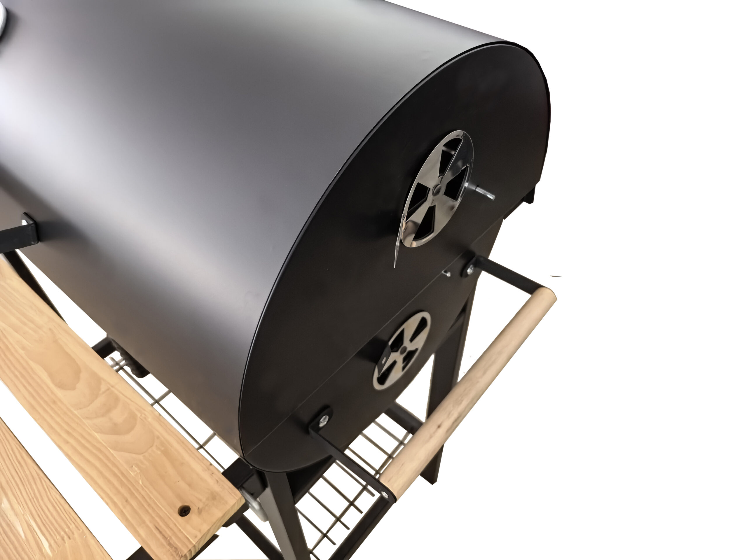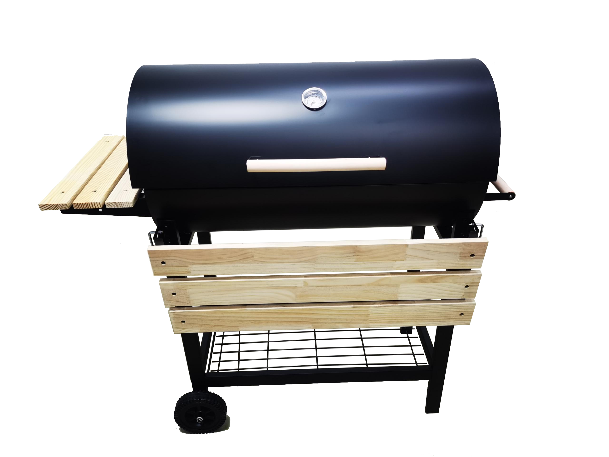 Imagine the joy of firing up a sleek, barrel-style charcoal grill, coated in matte black with sophisticated natural wood accents. This isn’t just a cooking tool; it’s a statement of elegance. The spacious barrel design ensures even heat distribution, allowing you to prepare delicious meals with consistent results. Whether it’s sizzling steaks or slow-smoked ribs, the intuitive heat management and precision control make cooking a breeze. Equipped with a built-in thermometer prominently –displayed on the lid, this grill grants you mastery over temperature regulation for perfect grilling every time.